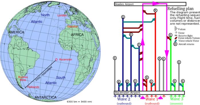 Чтобы бомбардировщик смог долететь до столицы Фолклендов г. Порт–Стэнли его сопровождали 12(!) самолётов–дозаправщиков СЗ "Виктор".