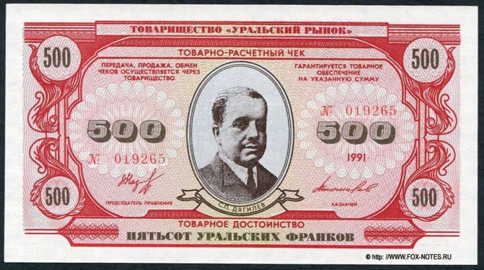 Отпечатано было 1 930 ооо штук номиналами 1, 5, 10, 20, 50, 100, 500 и 1000 "уральских франков" на сумму 56 млн франков. Оплату печати банкнот в сумме $ 20 ооо осуществило совместное предприятие "Ист Лайн" (г. Екатеринбург). Отпечатанные бланки в феврале 1992 г. были доставлены из Перми в Екатеринбург на военно–транспортном вертолёте и сданы на хранение в Ленинский филиал Свердлсоцбанка.