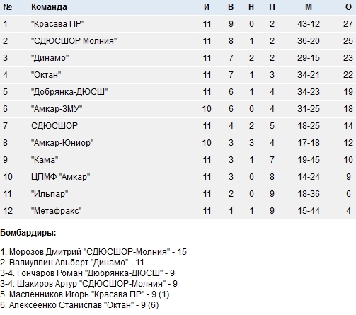 В минувшие выходные состоялись матчи заключительного, 11 тура Зимнего Первенства Пермского края по футболу сезона 2015-2016. Команда ЦПМФ «Амкар» уступила «Октану» - 1:2. В турнире осталось провести всего один матч – 14 марта «Амкар-Юниор» сыграет с «Амкаром-ЗМУ».