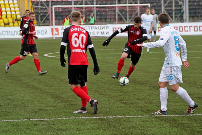 Резервисты «Зенита» приехали в Пермь в ранге фаворитов и одних из претендентов на победу во всем Первенстве. Этот статус они подтвердили в первом тайме, который во-первых, закончился в их пользу (1:0), во-вторых, гости имели ряд голевых моментов, в том числе одно попадание в штангу. В общем, первая половина игры не вселяла особого оптимизма для поклонников «красно-черных».