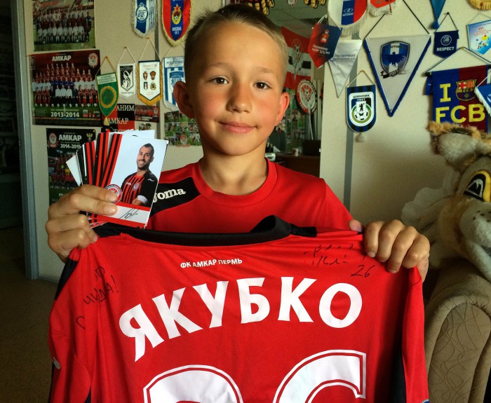 Одному из победителей, 7-летнему Диме Мякишеву особенно повезло – когда он пришел за подарком, то увидел самого Мартина Якубко (экс-амкаровец приехал в Пермь в отпуск на несколько дней) и тот вручил свою футболку. Кроме него, сегодня точно такие же подарки с настоящим автографом получили 8-летний Рома Шоронов, 7-летние Сева Наберухин и Тимофей Кудымов, 8-летний Влад Апкин.