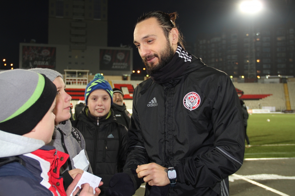 После дети вышли на игровое поле, где в тот момент «красно-черные» начинали тренировку. Школьники, углубленно изучающие английский язык, поговорили с иностранными футболистами Фегором Огуде, Александром Мильковичем и Дарко Бодулом. Игроки «Амкара» с удовольствием ответили на все вопросы детей, оставив им автографы на память.
